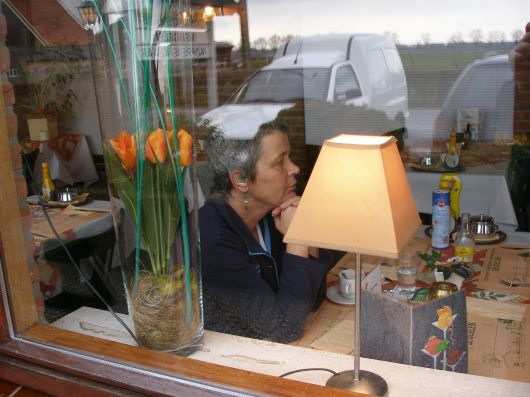 Ik zit in de wacht op de rekening in het pannenkoekenhuis. Jan is al naar buiten gegaan om mij vervolgens te fotograferen.