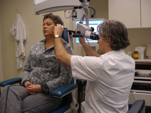 Op de stoel bij de KNO voor de maandelijkse uitzuigbeurt van mijn oren.