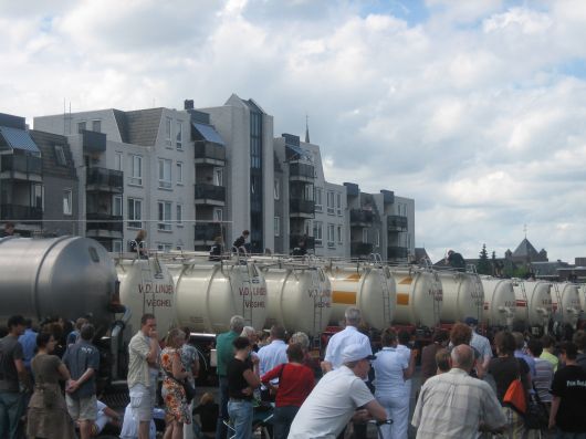 De tankwagens op het festival in Veghel waarop de jongens inmiddels bovenop zitten en het trommelconcert voortzetten vanaf de grond. Een indrukwekkend gezicht.
