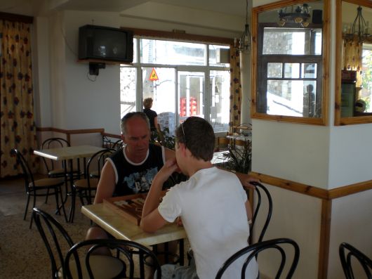 Als Jan bij de kapper zit, doet ieder z'n eigen ding. Gideon en Henk zijn aan het backgammen in het koffietentje.